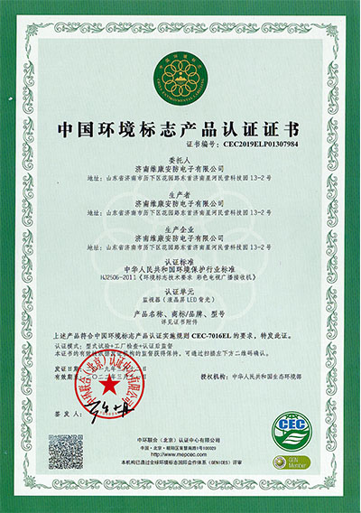 公司通過(guò)了CCC認(rèn)證、節(jié)能認(rèn)證、環(huán)境標(biāo)志產(chǎn)品認(rèn)證、公安部安全與警用電子產(chǎn)品質(zhì)量檢測(cè)中心檢測(cè)報(bào)告(CNAS認(rèn)證) 、ISO9001、14001、18001、CE、CB、FCC、ROHS、抗震防塵等多項(xiàng)資質(zhì)認(rèn)證,并入選《政采節(jié)能產(chǎn)品清單》。